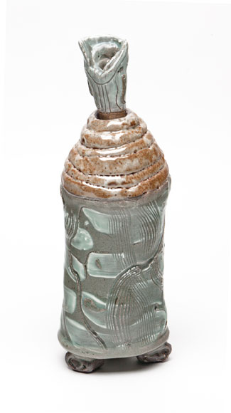My work moves back and forth from pottery and sculpture. Sometimes I use the wheel, at others I do hand building. Occasionally I combine both methods. Recently I have been using a device called a clay extruder. With this tool I form tubing of various diameters and lengths. Clay is put into the extruder and squeezed out, forming the ceramic tubes out of which my works are made.