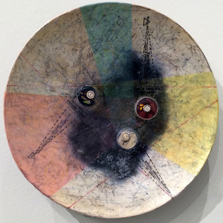 veo, ves, vemos 2014 |2014, 16" diameter x 6" deep tissue paper, graphite pencil, photocopy transparencies, encaustic, vintage watch crystals, corn seeds, parakeet feathers, on saggar fired ceramic platter |